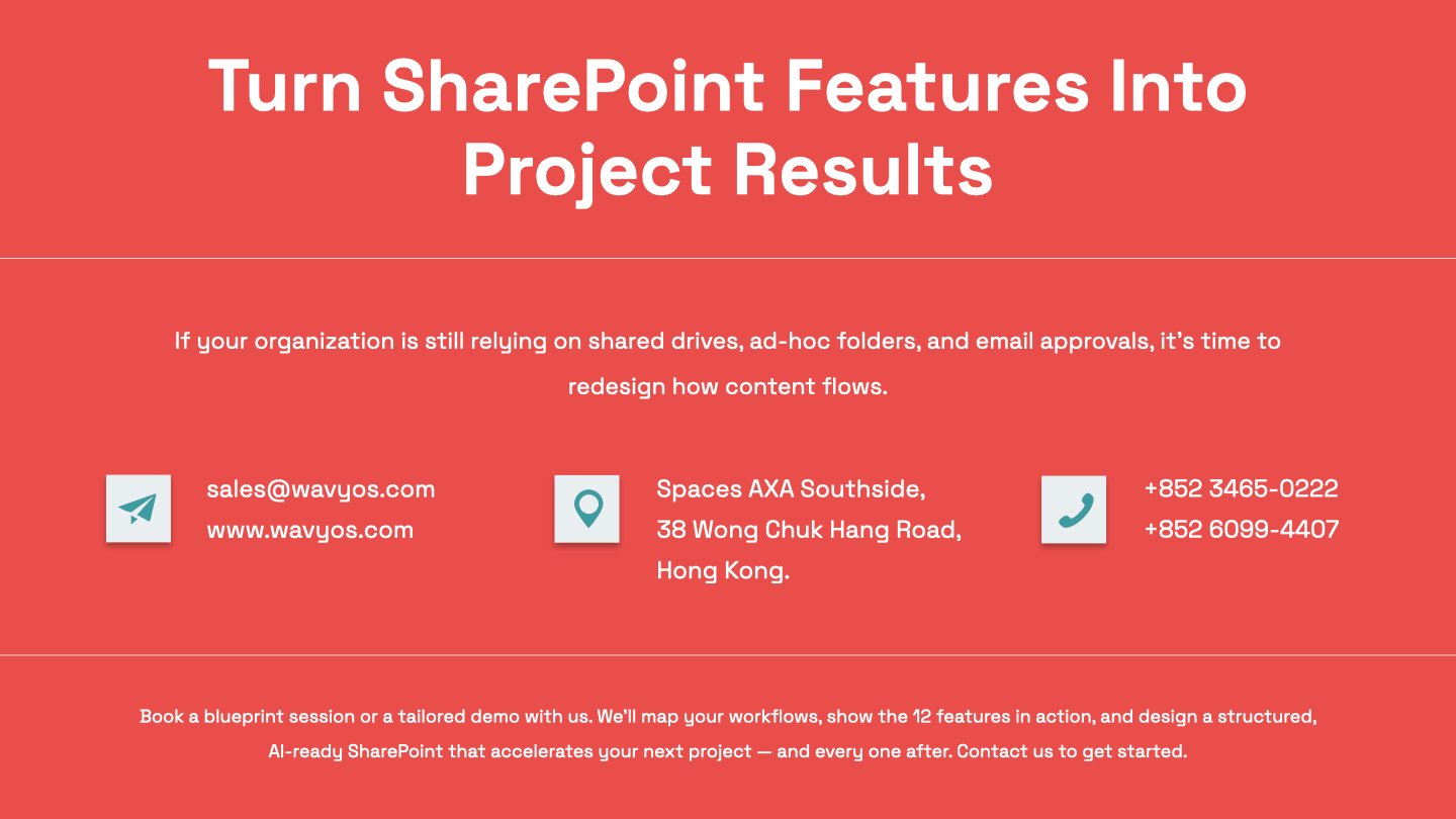 Book a blueprint session or a tailored demo with us. We’ll map your workflows, show the 12 features in action, and design a structured, AI-ready SharePoint that accelerates your next project — and every one after. Contact us to get started.