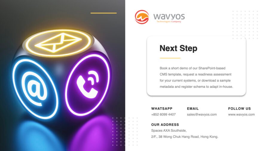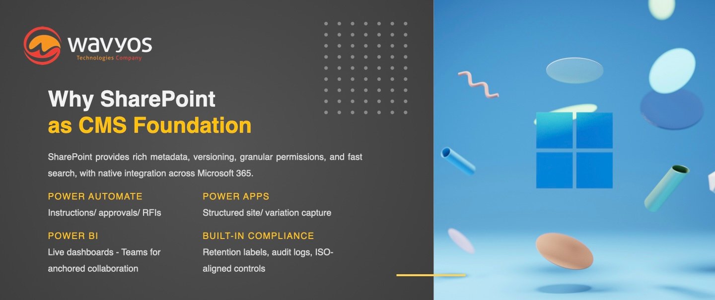 If this approach aligns with how you want to run your projects, take the next step. Book a short demo of our SharePoint-based CMS template, request a readiness assessment for your current systems, or download a sample metadata and register schema to adapt in-house. Contact us today.