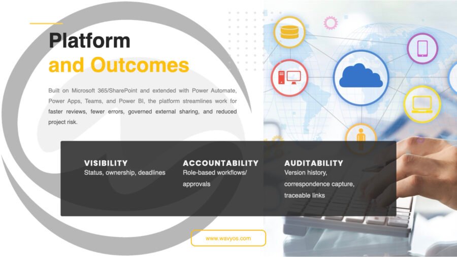 Built on Microsoft 365/ SharePoint, the Consultancy Management System (CMS) can be extended with Power Automate, Power Apps, Teams, and Power BI. This makes it flexible and scalable. Operationally, it provides clear visibility through status tracking, ownership records, and deadlines while ensuring accountability via role-based workflows and approvals. Auditability is maintained through full version history, correspondence capture, and traceable links. The result is faster reviews, fewer errors, and governed external sharing that reduces project risk. Key information — milestone slippage, change exposure, KPIs and payment integrity — is accessible through custom dashboards.