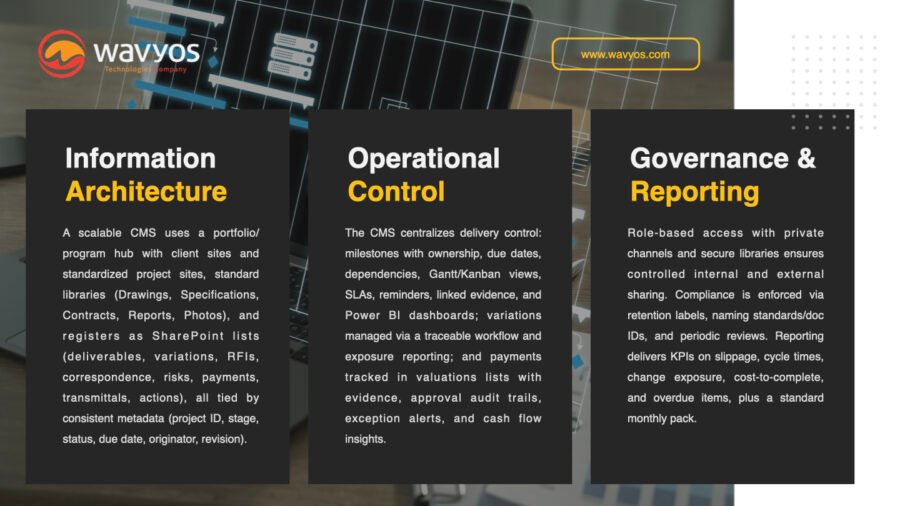 A single article cannot cover every SharePoint feature or every variation of QS and engineering workflow. The goal here is not to exhaust the topic, but to show that a well-designed CMS can bring discipline and visibility to the parts of your service that matter most: milestones, changes, and cost assurance.