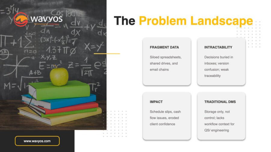 Discipline and technical skill don’t automatically deliver controlled projects. Too many engineering and QS practices still run on siloed spreadsheets, shared drives, and email chains. Data ends up in pockets: the planner tracks milestones, the QS updates the cost plan, and the design team issues drawings — often without real-time linkage. As a result, decisions sink into inboxes, versions multiply, and no one knows which document actually drove a change.